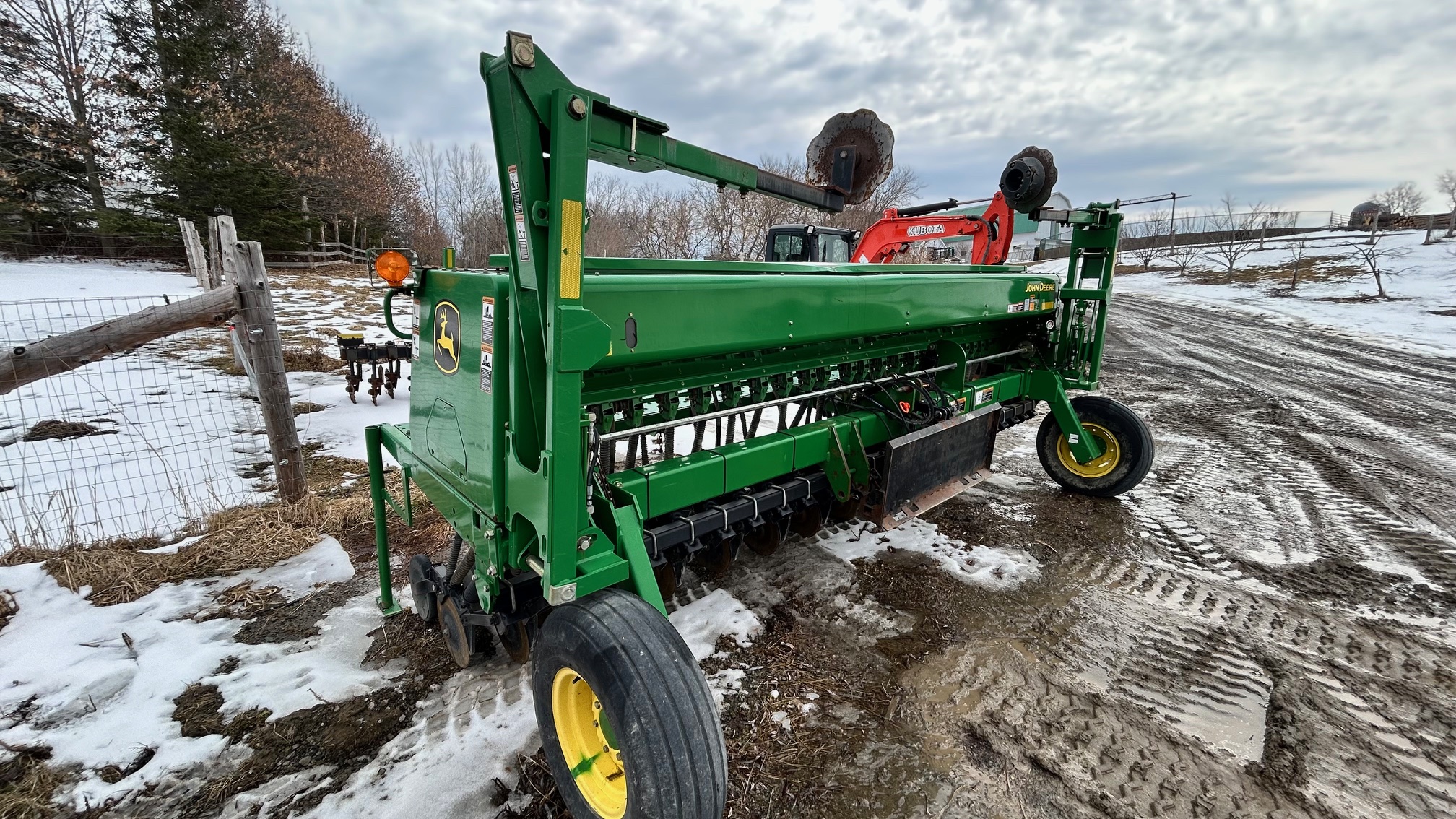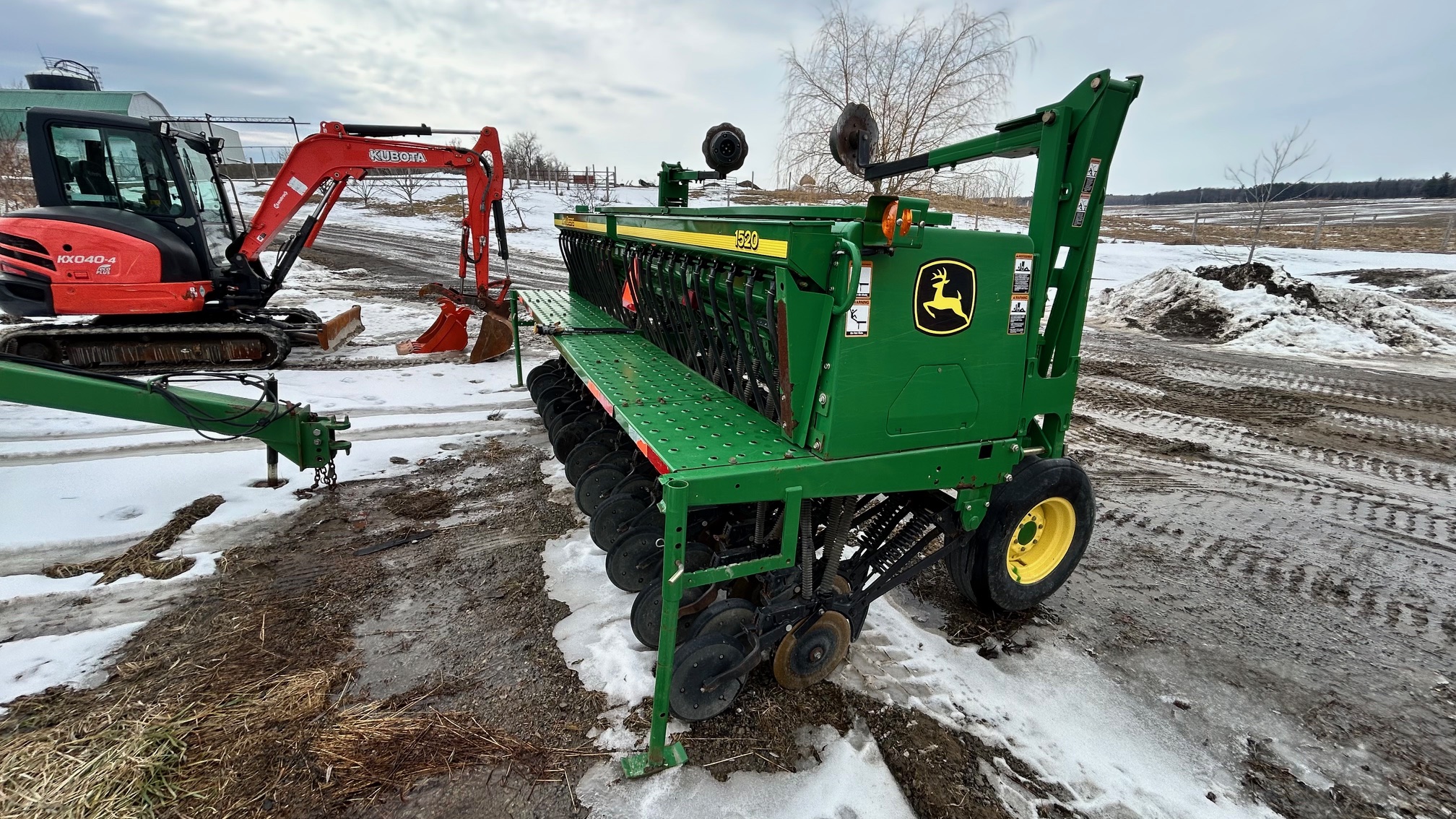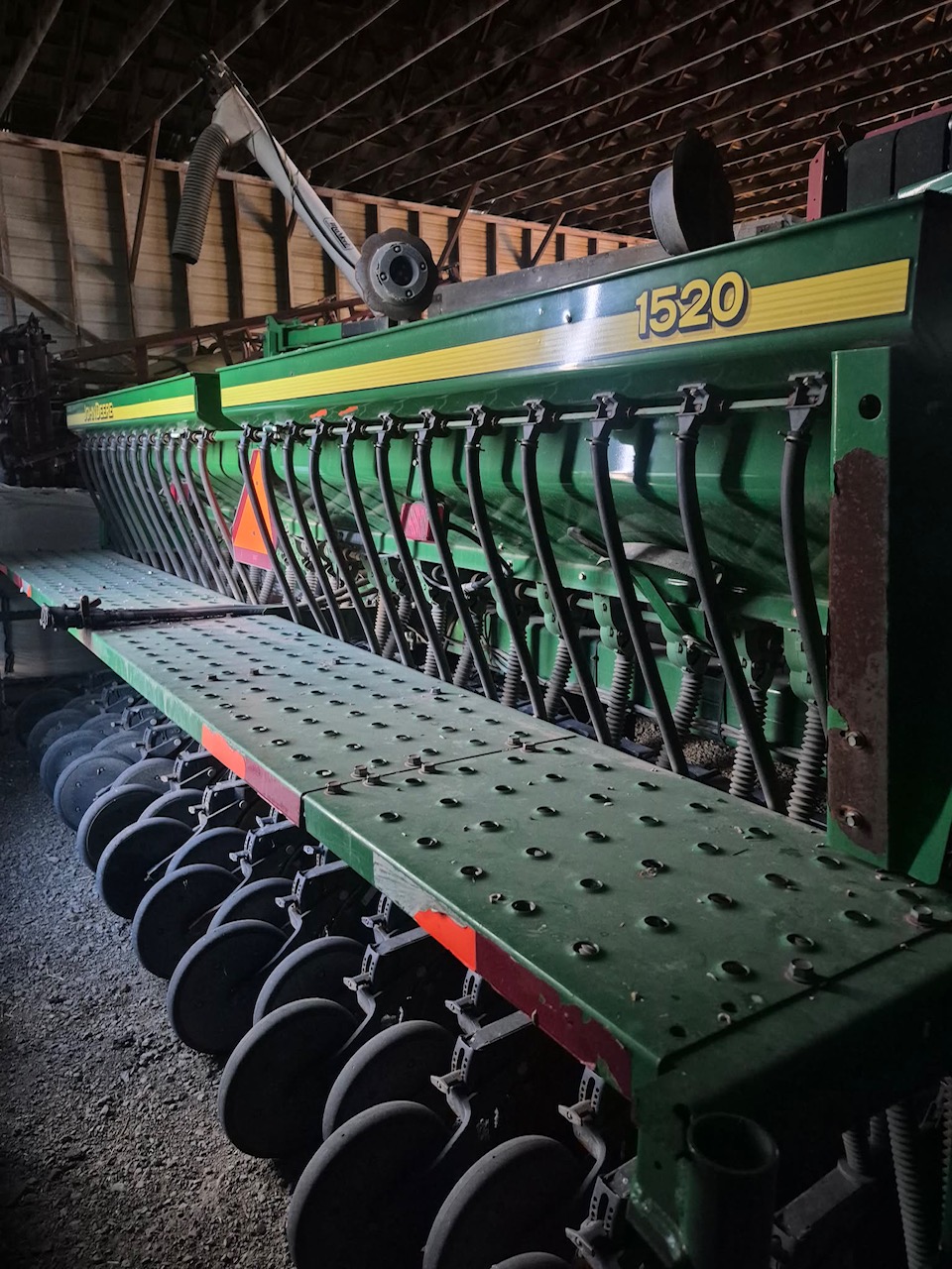 Semoir John Deere 1520, 15 pieds , disques au 7,5 pouces avec porte pour bloquer un rang sur deux pour semer au 15 pouces, boite a mil, marqueurs, il vient avec un Cart John Deere 1570 pour semer no-till très propre! Seulement le couvert qui a une légère bosse.