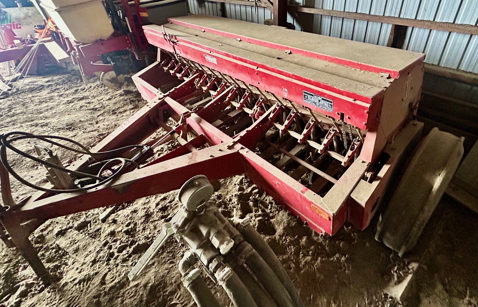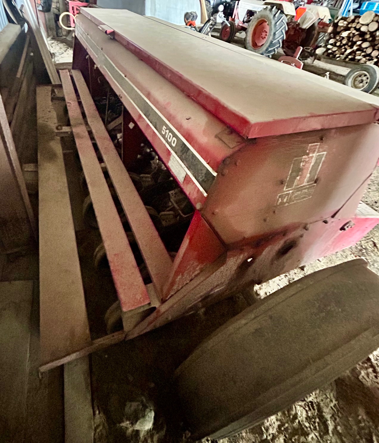 Semoir International 5100, 16 disques doubles, roues plombeuses, boite a mil, combiné à l’engrais, pneus marqueurs.